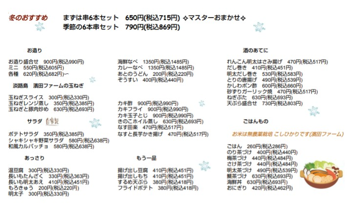 ・アスパラ・アスパラベーコン・ハムチーズ・ウインナー・うずら・えび・かしわ・キス・れんこん・牛肉・こんにゃく・ささみ梅じそ・しいたけ・ししとう・じゃがバター・たい・たこ・たまねぎ・ちくわ・長いも・なす・なんきん・にんにく・よもぎ麩・肉巻うずら・ピーマン・ヒレカツ・ホタテ・まぐろ・明太ちくわ・もち・砂ずり・さつまいも・紅生姜(国産)・ぎんなん(季節物)